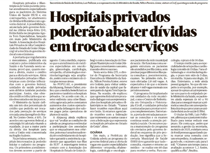 Em entrevista ao jornal O Popular, o médico Renato Daher, presidente da Associação dos Hospitais Privados de Alta Complexidade do Estado de Goiás (Ahpaceg), disse que a entidade recebe com otimismo a portaria conjunta dos Ministérios da Saúde e Fazenda que vai possibilitar a concessão de créditos financeiros a hospitais privados em troca da oferta de atendimentos especializados, com consultas, exames e cirurgias, à pacientes do Sistema Único de Saúde (SUS).